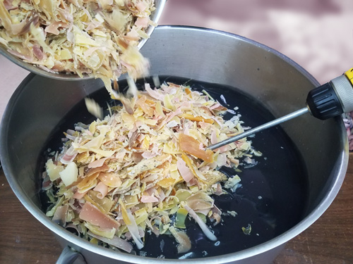 To make Meteor Showers, we add shreds of a variety of bars to our soap base, colored black from activated charcoal.